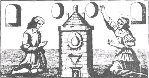 Рис.2- Пара алхимиков, стоящих перед печью на коленях и вымаливающих Божье благословение.